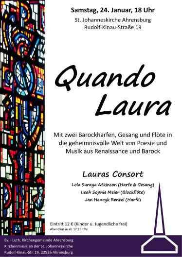 Kommen Sie am Samstag, den 24. Januar um 18 Uhr in diese Soirée in der Johanneskirche, erfahren Sie, was es mit „Laura“ auf sich hat, dass die Musik der Renaissance viel wilder, poetischer und fantasievoller ist, als man sich die Musik dieser Zeit gemeinhin vorstellt und dass sich in solch einem Rahmen eine viel intensivere Beziehung zwischen Musikern und Publikum bildet.