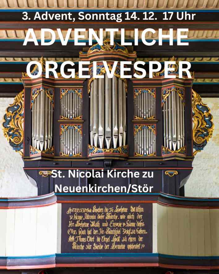 Herzliche Einladung am 3. Advent um 17 Uhr in die wunderschöne St. Nicolai Kirche in Neuenkirchen zur adventlichen Orgelvesper mit Kristian Schneider (an der historischen Johann-Daniel-Busch-Orgel) und Christiane Müller (Lesung).